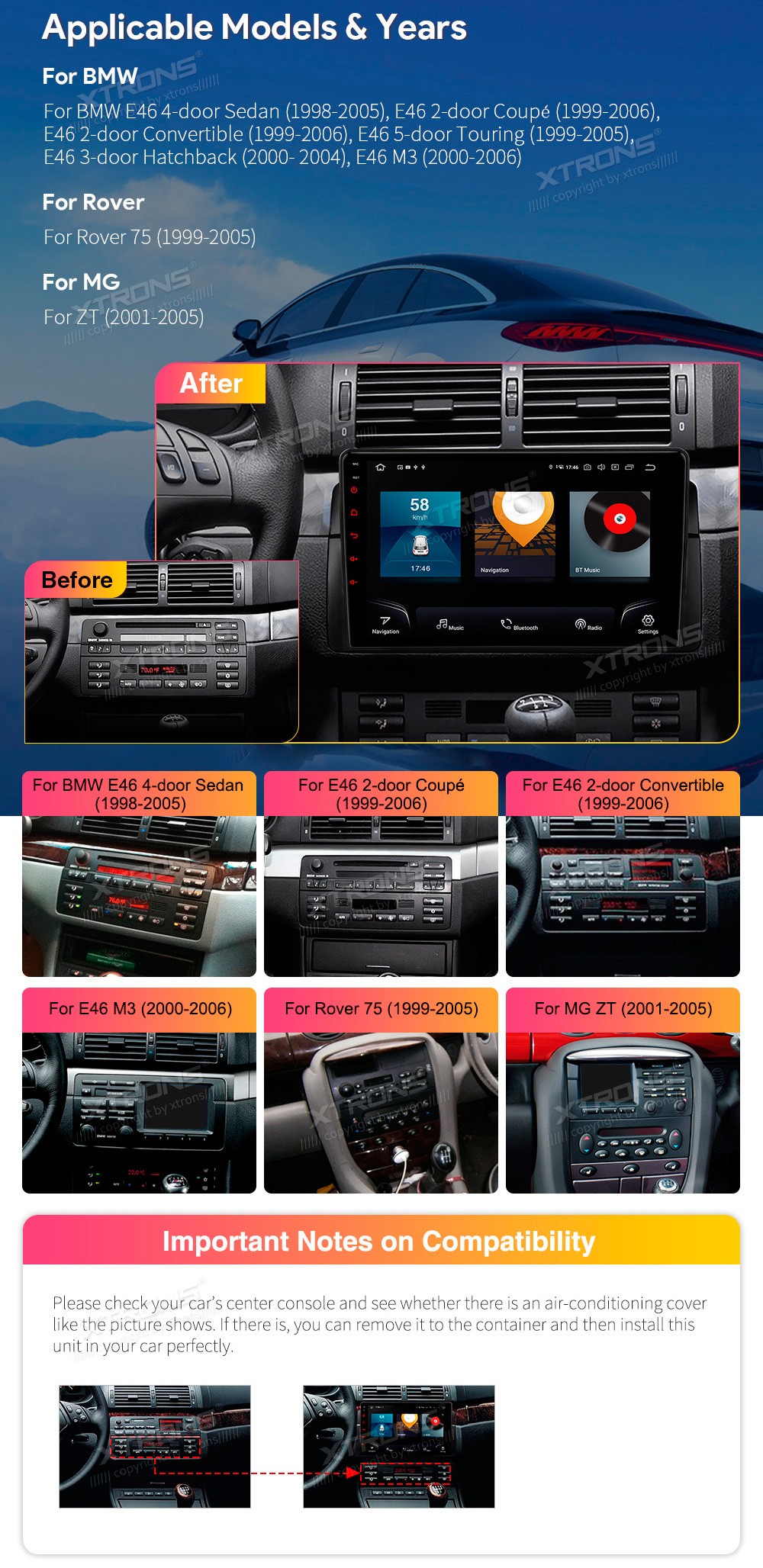 XTRONS IQP9246BP 9.0" BMW, Rover, MG Multimeedia Android 12.0 Octa CoreBMW E46 4-door Sedan (1998-2005), E46 2-door Coupe; (1999-2006), E46 2-door Convertible (1999-2006), E46 5-door Touring (1999-2005), E46 3-door Hatchback (2000- 2004), E46 M3 (2000-2006)Rover 75 (1999-2005)MG ZT (2001-2005)Ta ...