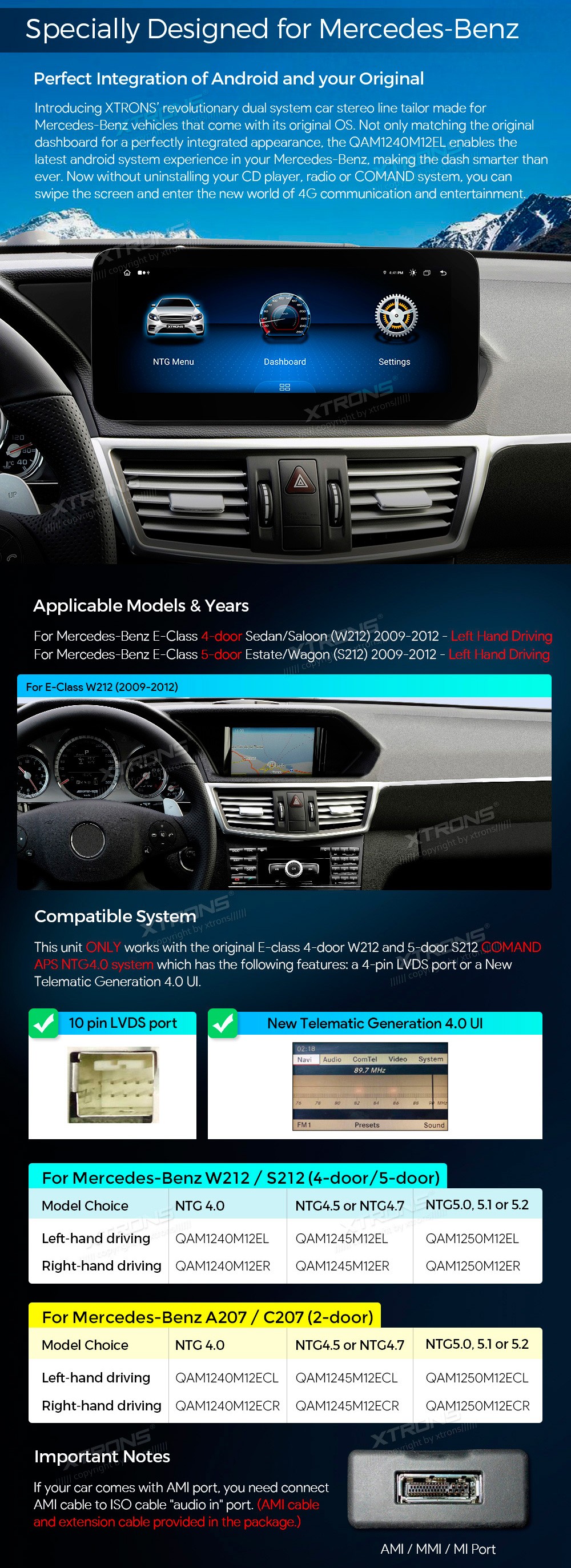 XTRONS QAM1240M12EL 10.25" Mercedes-Benz E-Class W212, S212 Multimeedia Android 13.0 Octa-CoreMercedes-BenzE-Class W212(2009-2012) NTG 4.0E-Class S212(2009-2012) NTG 4.0Tarkvara: Android 13.010.25" HD puuteekraan 1920*720px, IPS G+G HDProtsessor Octa-Core 2xCortex-A75 2.0GHz + 6xCortex-A55 1.7GHz 64 ...
