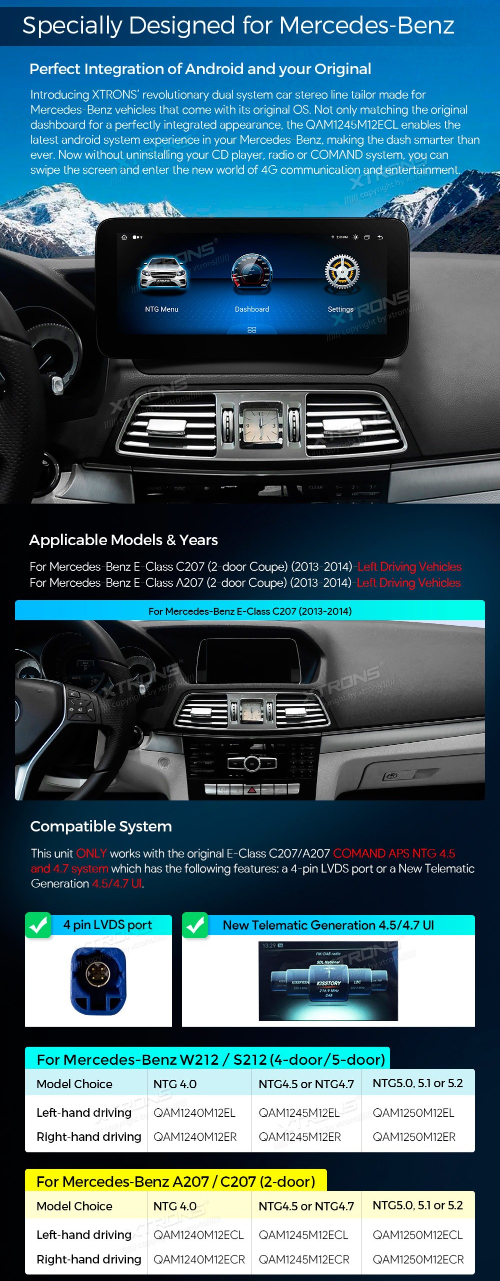 XTRONS QAM1245M12ECL 10.25" Mercedes-Benz E-Class C207, A207 Multimeedia Android 13.0 Octa-CoreMercedes-BenzE-Class C207(2013-2014) NTG 4.5, NTG 4.7E-Class A207(2013-2014) NTG 4.5, NTG 4.7Tarkvara: Android 13.010.25" HD puuteekraan 1920*720px, IPS G+G HDProtsessor Octa-Core 2xCortex-A75 2.0GHz + 6xC ...