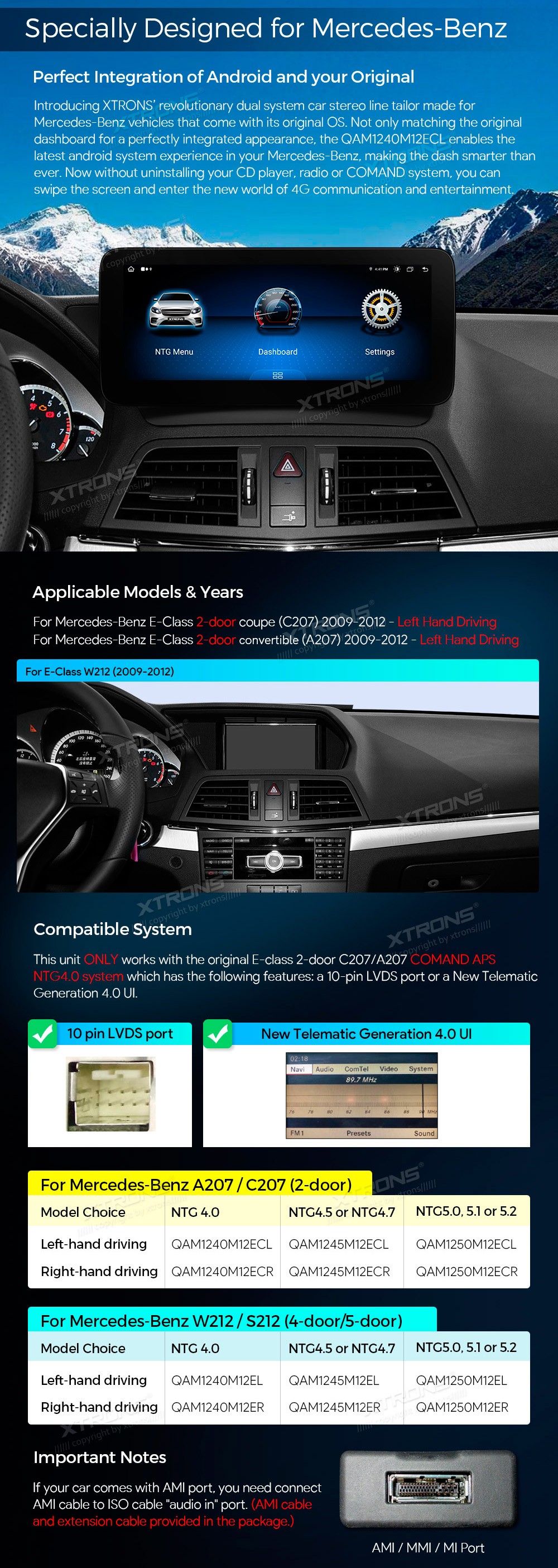 XTRONS QAM1240M12ECL 10.25" Mercedes-Benz E-Class C207, A207 Multimeedia Android 13.0 Octa-CoreMercedes-BenzE-Class C207(2009-2012) NTG 4.0E-Class A207(2009-2012) NTG 4.0Tarkvara: Android 13.010.25" HD puuteekraan 1920*720px, IPS G+G HDProtsessor Octa-Core 2xCortex-A75 2.0GHz + 6xCortex-A55 1.7GHz 6 ...