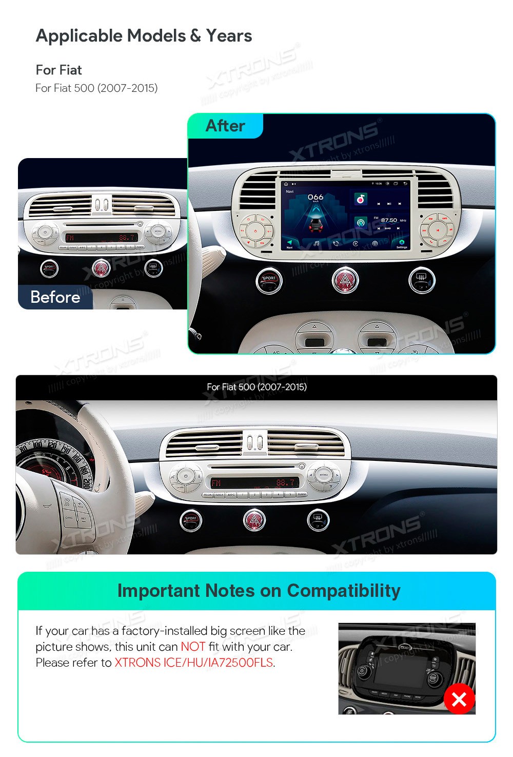 XTRONS IA7250FLCS 7.0" FIAT 500 Multimeedia Android 13.0 Octa-CoreFIAT 500 (2007-2015)Tarkvara: Android 13.07.0" HD puuteekraan 1024*600px, IPSProtsessor MediaTek Cortex-A75 x 2 + Cortex-A55 x 6 Octa-Core 64bitMuutmälu 4GB, 64GB sisemäluGPS NavigatsioonCAR AutoPlay (Bluetooth) AndroidAuto (Bluetooth ...