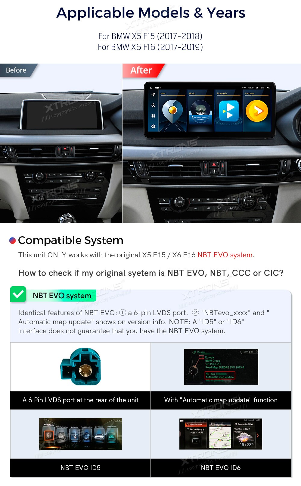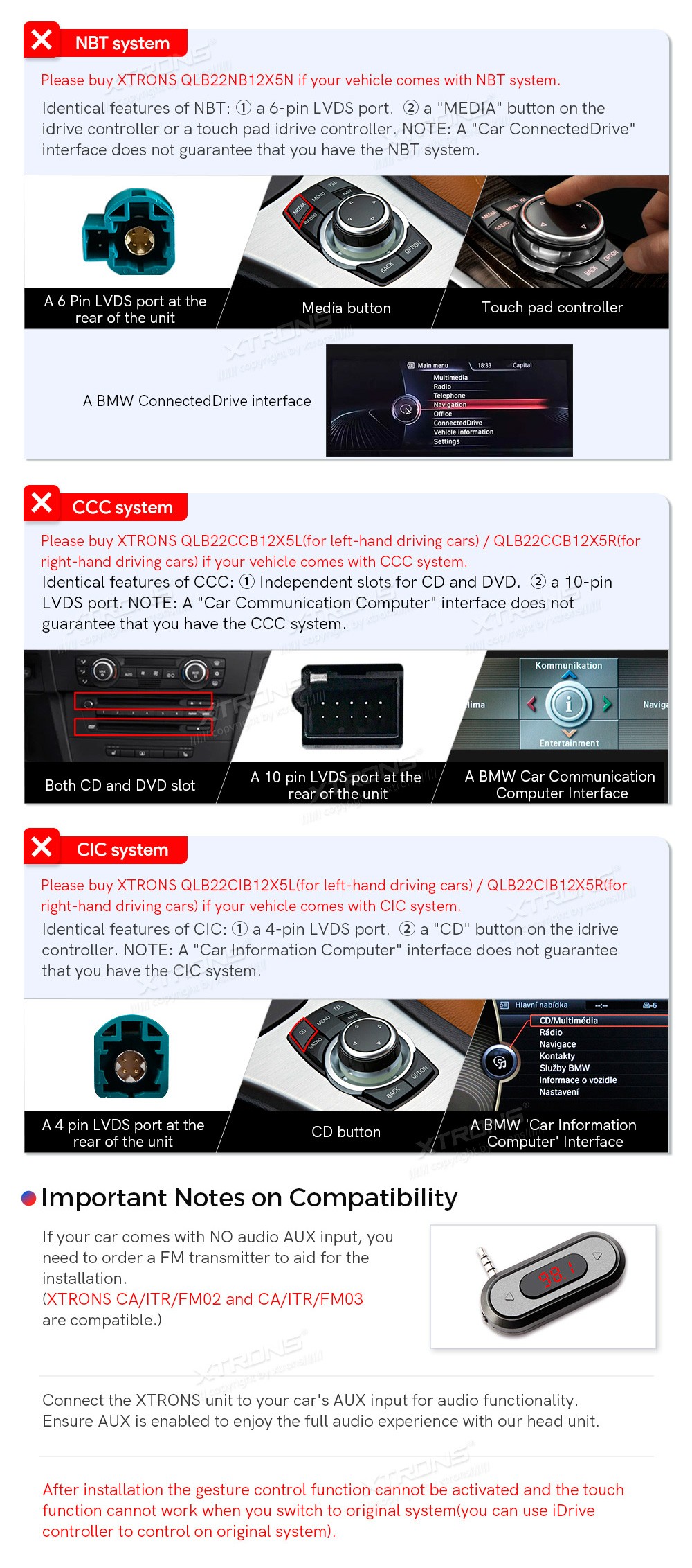 XTRONS QLB22EVB12X5N 12.3" BMW X5 F15, X6 F16 NBT EVO Multimeedia Android 13.0 Octa-Core BMW X5 F15 (2017-2018)BMW X6 F16 (2017-2018)(Sobib, kui sõidukil on NBT EVO süsteem.)Tarkvara: Android 13.012.3" HD puuteekraan 1920*720px, IPS HDProtsessor Octa-Core 2xCortex-A75 2.0GHz + 6xCortex-A55 1.7GHz 64 ...
