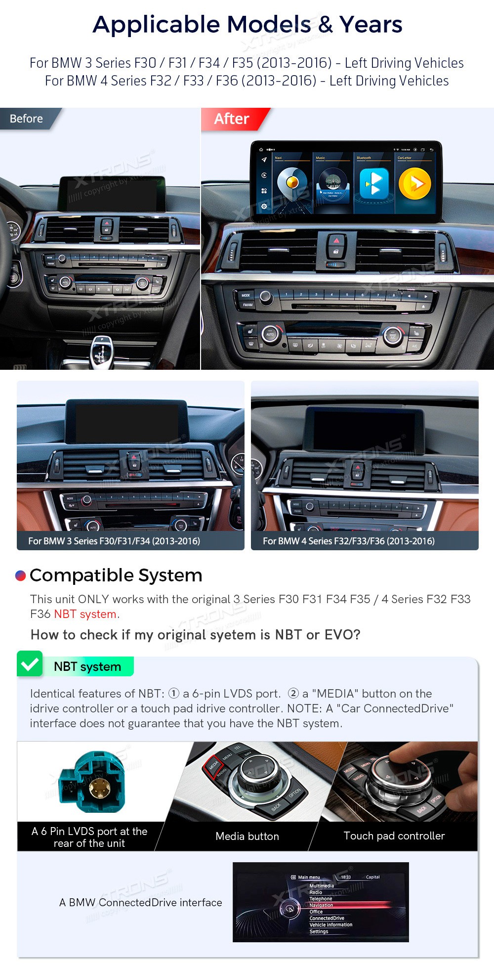 XTRONS QLB22NB12THL 12.3" BMW 3, 4 NBT Multimeedia Android 13.0 Octa-Core BMW 3 Series F30, F31, F34, F35 (2013-2016)BMW 4 Series F32, F33, F36 (2013-2016)(Sobib, kui sõidukil on NBT süsteem.)Tarkvara: Android 13.012.3" HD puuteekraan 1920*720px, IPS HDProtsessor Octa-Core 2xCortex-A75 2.0GHz + ...