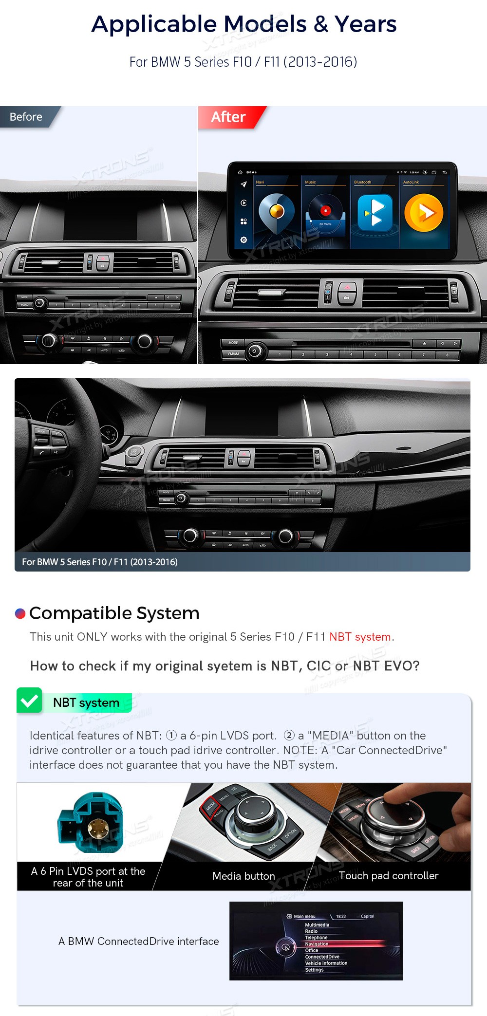 XTRONS QLB22NB12FV 12.3" BMW 5 F10, F11 NBT Multimeedia Android 13.0 Octa-Core BMW 5 Series F10, F11 (2013-2016) (Sobib, kui sõidukil on NBT süsteem.)Tarkvara: Android 13.012.3" HD puuteekraan 1920*720px, IPS HDProtsessor Octa-Core 2xCortex-A75 2.0GHz + 6xCortex-A55 1.7GHz 64bitMuutmälu DDR4 4G ...