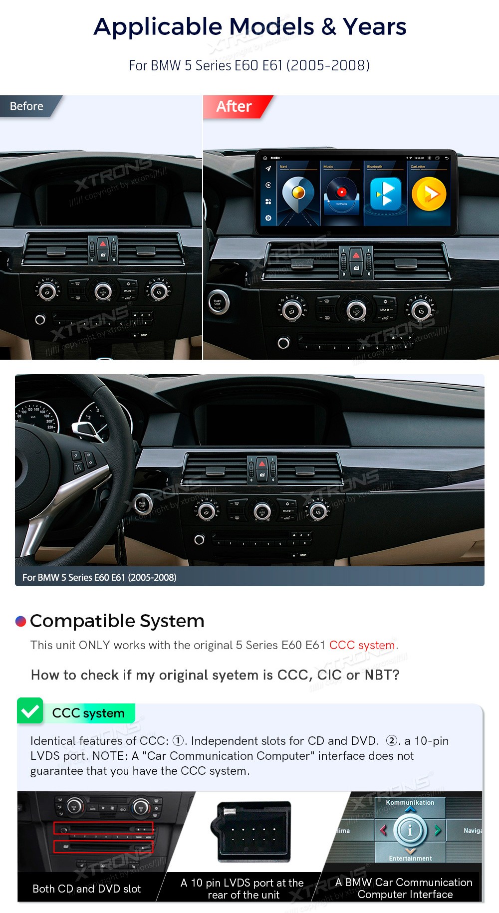 XTRONS QLB22CCB12E60 12.3" BMW E60, E61 CСC Multimeedia Android 13.0 Octa-Core BMW 5 Series E60, E61 (2005-2008) (Sobib, kui sõidukil on CСC süsteem.)Tarkvara: Android 13.012.3" HD puuteekraan 1920*720px, IPS HDProtsessor Octa-Core 2xCortex-A75 2.0GHz + 6xCortex-A55 1.7GHz 64bitMuutmälu DDR4 4G ...