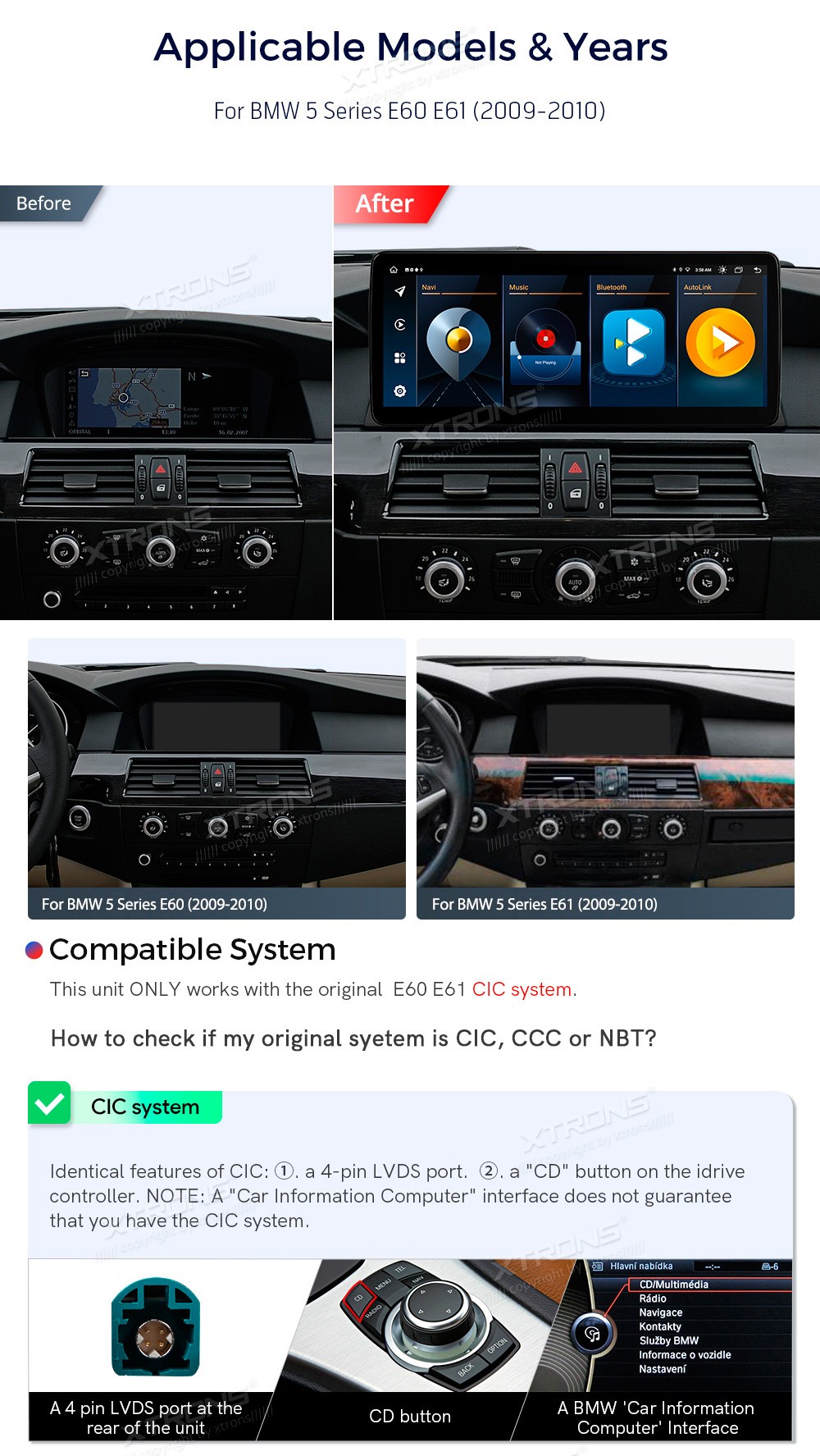 XTRONS QLB22CIB12E60 12.3" BMW E60, E61 CIC Multimeedia Android 13.0 Octa-Core BMW 5 Series E60, E61 (2009-2012) (Sobib, kui sõidukil on CIC süsteem.)Tarkvara: Android 13.012.3" HD puuteekraan 1920*720px, IPS HDProtsessor Octa-Core 2xCortex-A75 2.0GHz + 6xCortex-A55 1.7GHz 64bitMuutmälu DDR4 4G ...