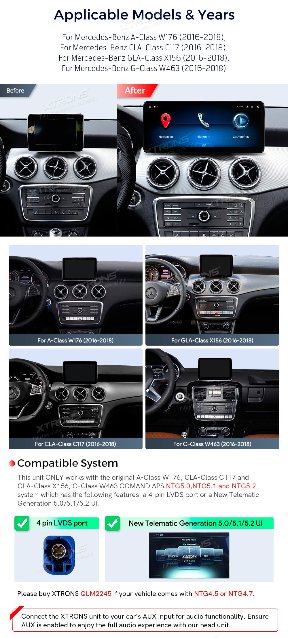 XTRONS QLM2250 12.3" Mercedes-Benz C117, X156, W463 Multimeedia Android 14.0 Octa-Core Mercedes-BenzA-Class W176(2016-2018) NTG 5.0, NTG 5.1, NTG 5.2CLA-Class C117(2016-2018) NTG 5.0, NTG 5.1, NTG 5.2 GLA-Class X156(2016-2018) NTG 5.0, NTG 5.1, NTG 5.2G-Class W463(2016-2018) NTG 5.0, NTG 5 ...