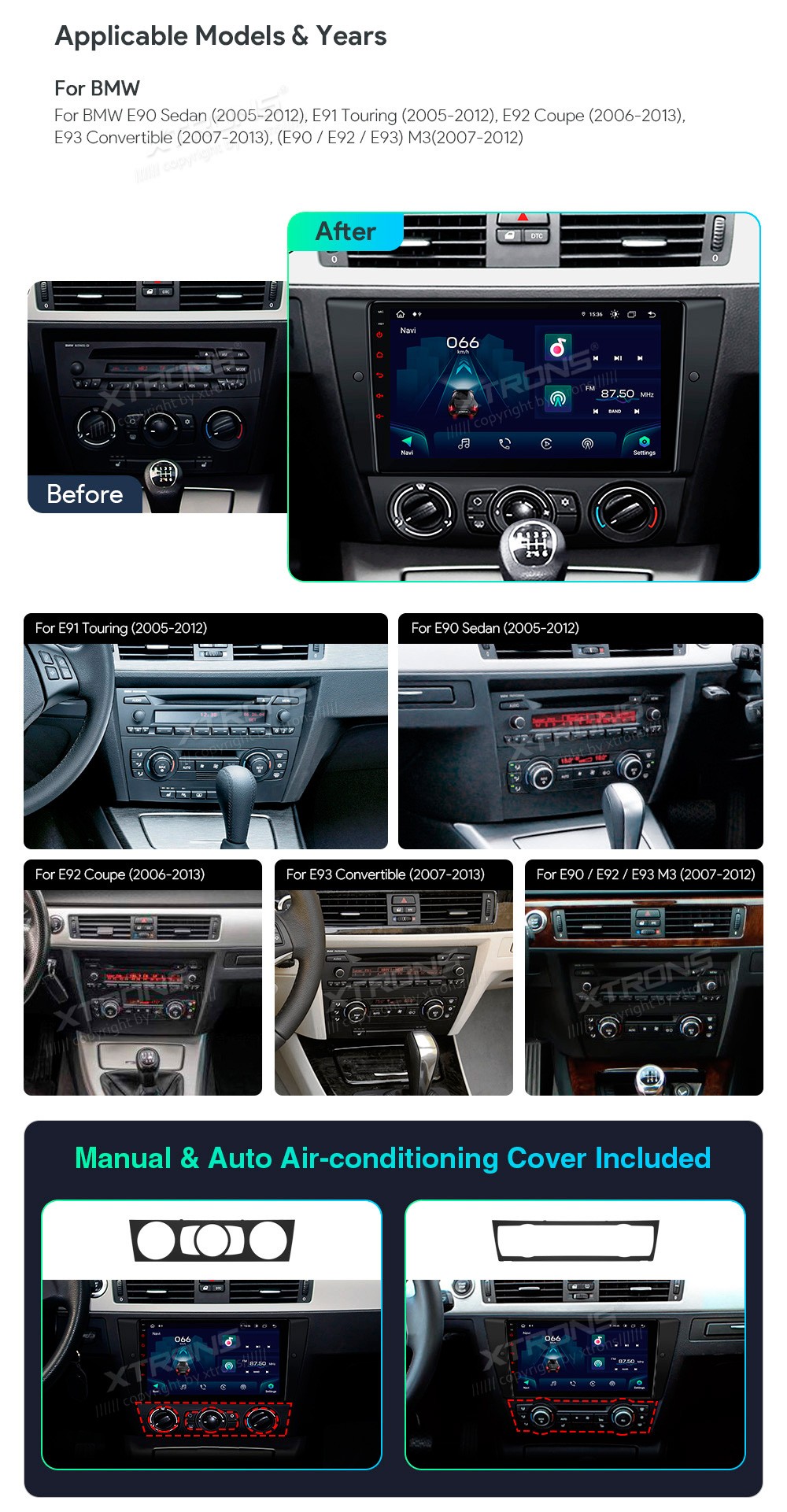 XTRONS IAP9290BS 9.0" BMW E90, E91, E92, E93, M3 Multimeedia Android 13.0 Octa-CoreBMW E90 Sedan (2005-2012), E91 Touring (2005-2012), E92 Coupe (2006-2013), E93 Convertible (2007-2013), (E90 / E92 / E93) M3 (2007-2012)Tarkvara: Android 13.09.0" HD puuteekraan 1280*720px, IPSProtsessor MediaTek ...