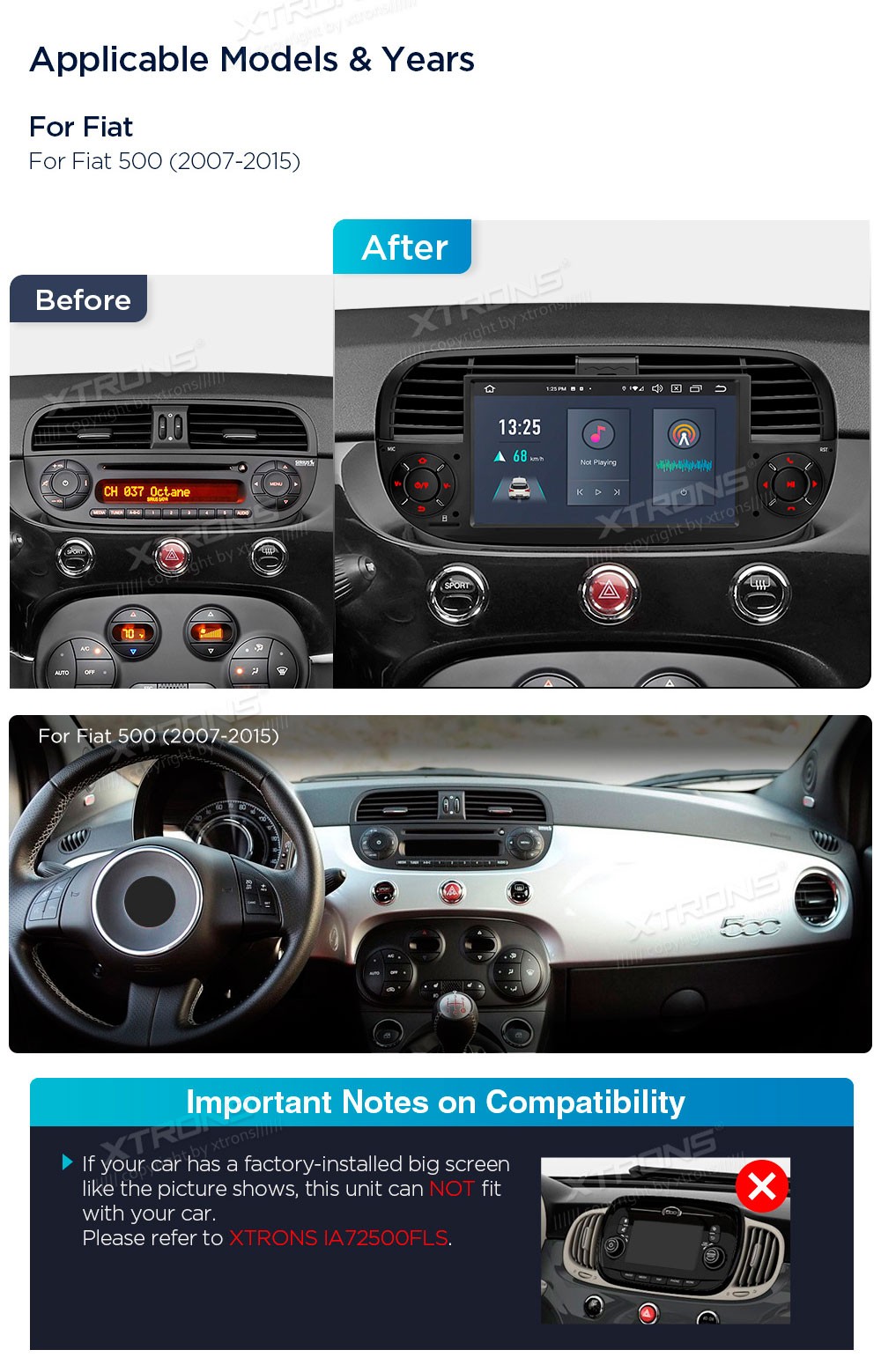 XTRONS PXS7250FBL 7.0" FIAT 500 Multimeedia Android 13.0 Octa-CoreFIAT 500 (2007-2015)Tarkvara: Android 13.07.0" HD puuteekraan 1024*600px, IPSProtsessor  Octa-Core 64bit 2.0GHzMuutmälu 2GB DDR4, 32GB EMMC 5.1 sisemäluGPS NavigatsioonCAR AutoPlay (Bluetooth) AndroidAuto (Bluetooth ja juhtmega USB)HD ...