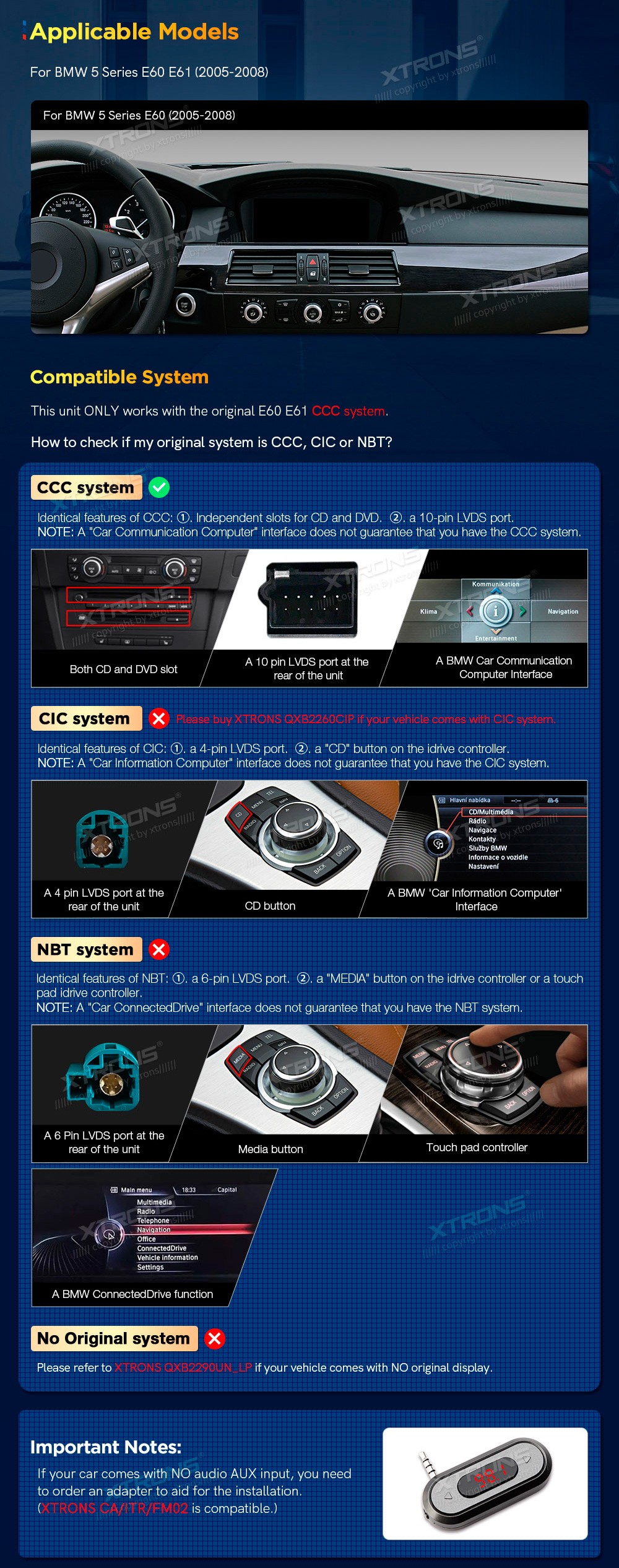 XTRONS QXB22CCB12E60 12.3" BMW E60, E61 CCC Multimeedia Android 12.0 Octa-Core BMW 5 Series E60 E61 (2005-2008) (Sobib, kui sõidukil on CCC süsteem.)Tarkvara: Android 12.012.3" HD puuteekraan 1920*720px, IPSProtsessor Qualcomm Snapdragon 662 Octa-Core 4xCortex-A73 2.0GHz + 4xCortex-A53 1.8GHz 6 ...