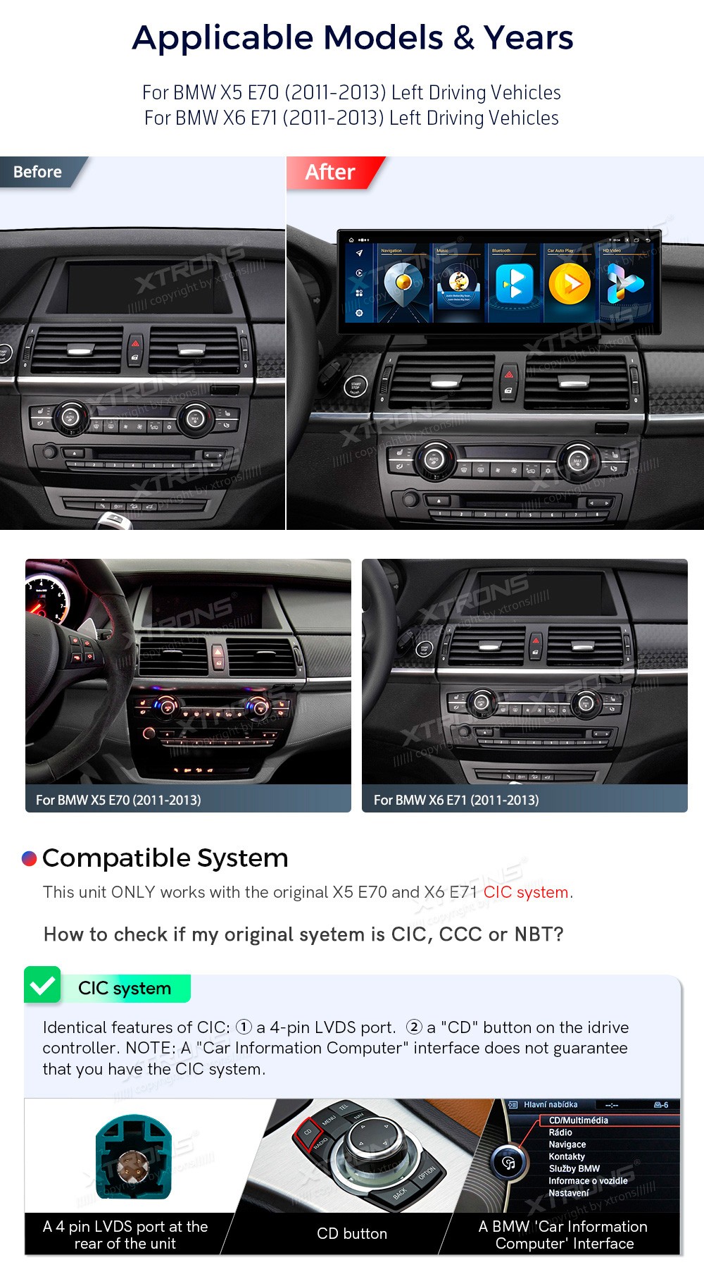 XTRONS QLB42X5CIL 14.9" BMW X5 E70, X6 E71, CIC Multimeedia Android 13.0 Octa-Core 4G BMW X5 E70 (2011-2013)BMW X6 E71 (2011-2013)(Sobib, kui sõidukil on CIC süsteem.)Tarkvara: Android 13.014.9" HD puuteekraan 2560*720px, IPS HDProtsessor Octa-Core 2xCortex-A75 2.0GHz + 6xCortex-A55 1.7GHz 64bi ...