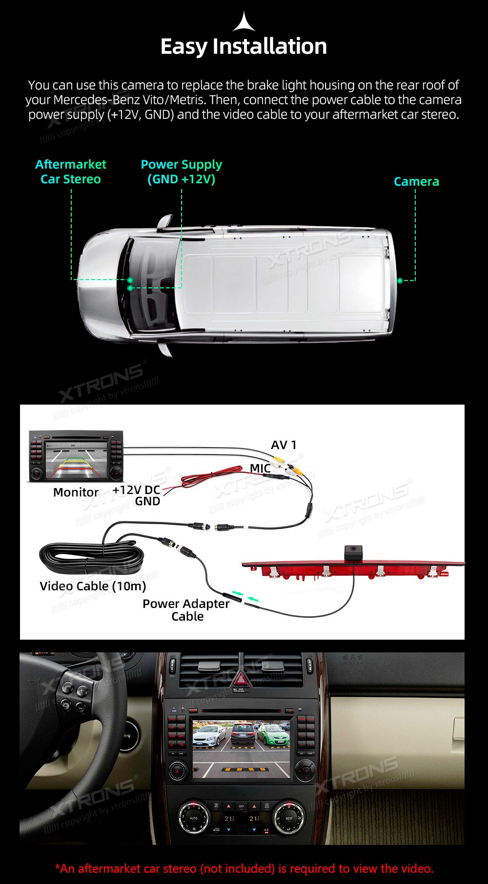 XTRONS ACCAMMBV001 Mercedes-Benz Vito Tailgate 2016 KaameraVaatenurk: 145ºVideo režiim: NTSC / PALFormaat: 976*592px, 700TVL, 0.1LuxTööpinge: +12VVideo väljundMikrofooni väljundTöötemperatuur: -20ºC~+70ºCVeekindlus: IP69K ...Saadaval olevate toodete tarneaeg on 2-4 tööpäeva pärast kliendi tellimuse tasumist (raha laekumist Akustika.EE OÜ pangakontole). Kui tellitud kaup pole pärast tellimuse esitamist saadaval või on ette näha viivitust tarneajas, võtame Teiega ühe tööpäeva jooksul ühendust.