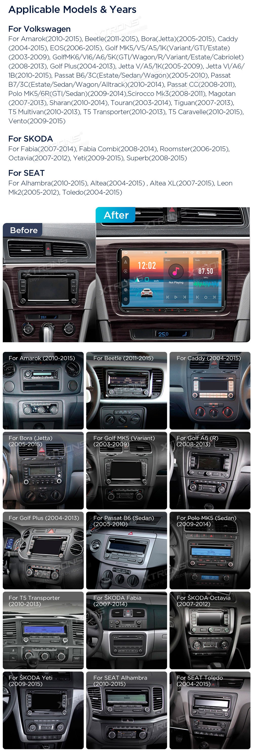 XTRONS PX94MTVL 9.0" VOLKSWAGEN, SEAT, SKODA Multimeedia Android 14.0 Octa-Core 4G VolkswagenAmarok (2010-2015), Beetle (2011-2015), Bora (Jetta)(2005-2015), Caddy (2004-2015), EOS (2006-2015), Golf MK5/V5/A5/1K(Variant/GTI/Estate)(2003-2009), Golf MK6/VI6/A6/5K(GTI/Wagon/R/Variant/Estate ...