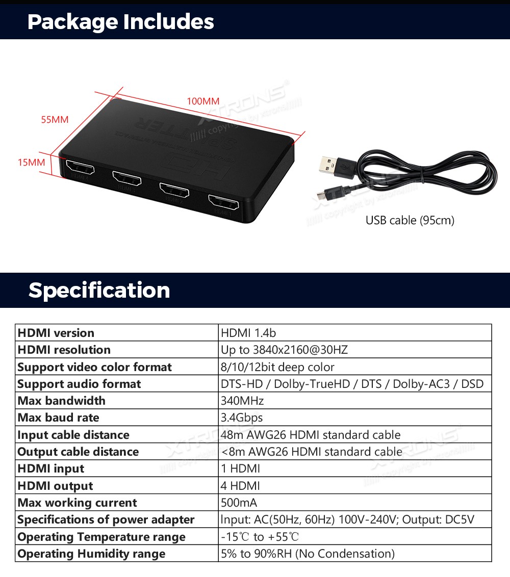 XTRONS ACHDMI1TO4 HDMI Jagaja x 41 Input 4 Output HDMI Splitter 4K 30HzSpecial Features*4K Ultra HD Resoiution*Support Full 3D/Dolby Audio/12-bit Color*Superior Signal Stability for Extended Ranges*High Quality ABS, more Durable ...