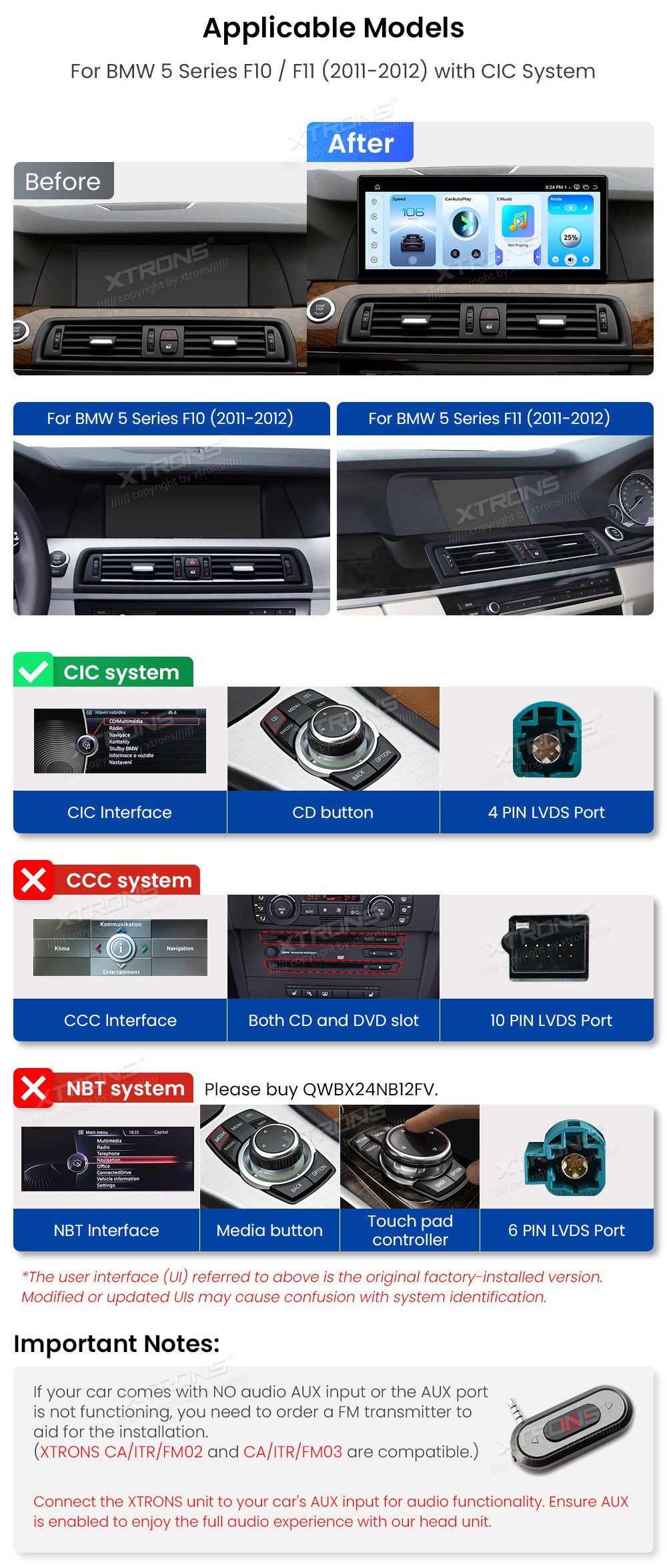 XTRONS QWBX24CIB12FV 12.3" BMW 5 Seeria F10, F11 CIC Multimeedia Android 14 Octa-Core 4G BMW 5 Seeria F10 / F11 (2011-2012) (Sobib, kui sõidukil on CIC süsteem.)Tarkvara: Android 1412.3" HD puuteekraan 2400*900px, IPS HD G+GProtsessor Qualcomm Snapdragon 685 Octa-Core 64bit 2.8GHzMuutmälu ...