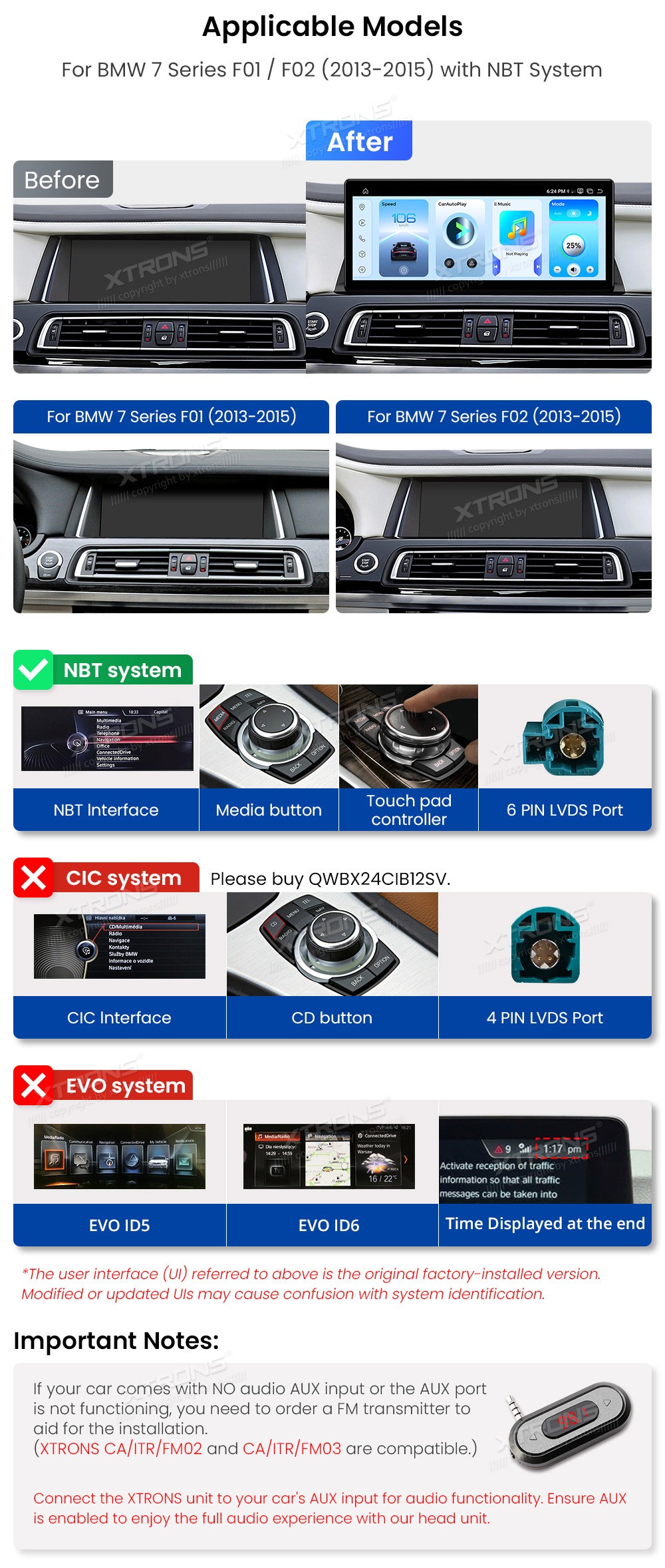 XTRONS QWBX24NB12SV 12.3" BMW 7 Seeria F01, F02 NBT Multimeedia Android 14 Octa-Core 4G BMW 7 Seeria F01 / F02 (2013-2015) (Sobib, kui sõidukil on NBT süsteem.)Tarkvara: Android 1412.3" HD puuteekraan 2400*900px, IPS HD G+GProtsessor Qualcomm Snapdragon 685 Octa-Core 64bit 2.8GHzMuutmälu D ...Lisaseadmed