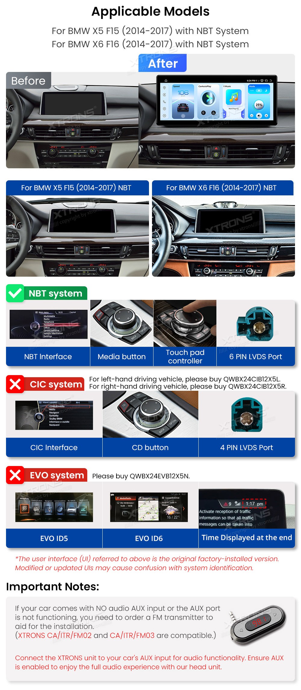 XTRONS QWBX24NB12X5N 12.3" BMW X5 F15, X6 F16 NBT Multimeedia Android 14 Octa-Core 4G BMW X5 F15 (2014-2017)BMW X6 F16 (2014-2017)(Sobib, kui sõidukil on NBT süsteem.)Tarkvara: Android 1412.3" HD puuteekraan 2400*900px, IPS HD G+GProtsessor Qualcomm Snapdragon 685 Octa-Core 64bit 2.8GHzMuutmälu DDR4 ...Lisaseadmed