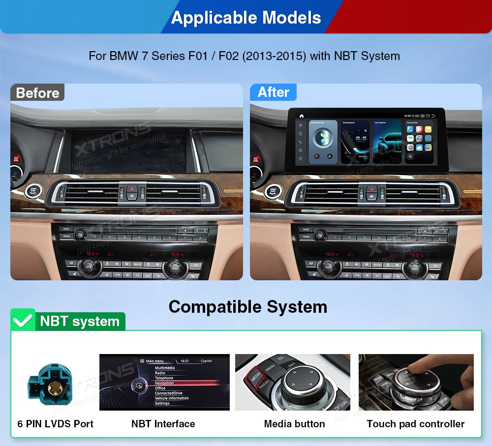 XTRONS QGB24NB12SV 12.3" BMW 7 Seeria F01, F02 NBT Multimeedia Android 14.0 Octa-Core 4G BMW 7 Seeria F01 / F02 (2013-2015) (Sobib, kui sõidukil on NBT süsteem.)Tarkvara: Android 14.012.3" 2400*900px, 60Hz, IPS G+G HD puuteekraanProtsessor Octa-Core Qualcomm Kryo 256 2.4GHz 64bit, 6nmMuutmälu LPDDR4 ...Lisaseadmed