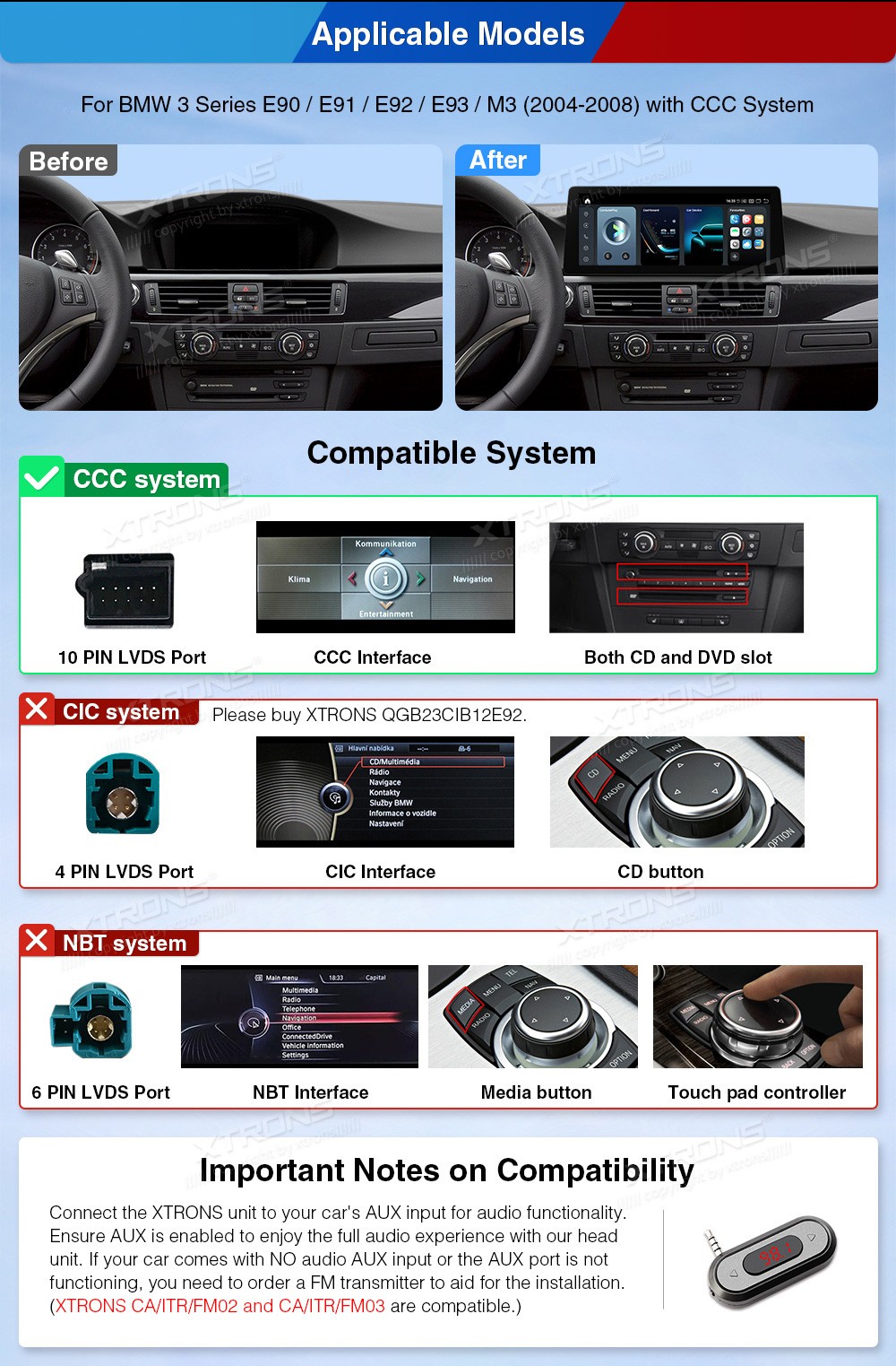 XTRONS QGB24CCB12E92 12.3" BMW 3 Seeria E90, E91, E92, E93, M3 CCC Multimeedia Android 14.0 Octa-Core 4G BMW 3 Seeria E90, E91, E92, E93, M3 (2004-2008) (Sobib, kui sõidukil on CCC süsteem.)Tarkvara: Android 14.012.3" 2400*900px, 60Hz, IPS G+G HD puuteekraanProtsessor Octa-Core Qualcomm Kryo 256 2.4 ...Lisaseadmed
