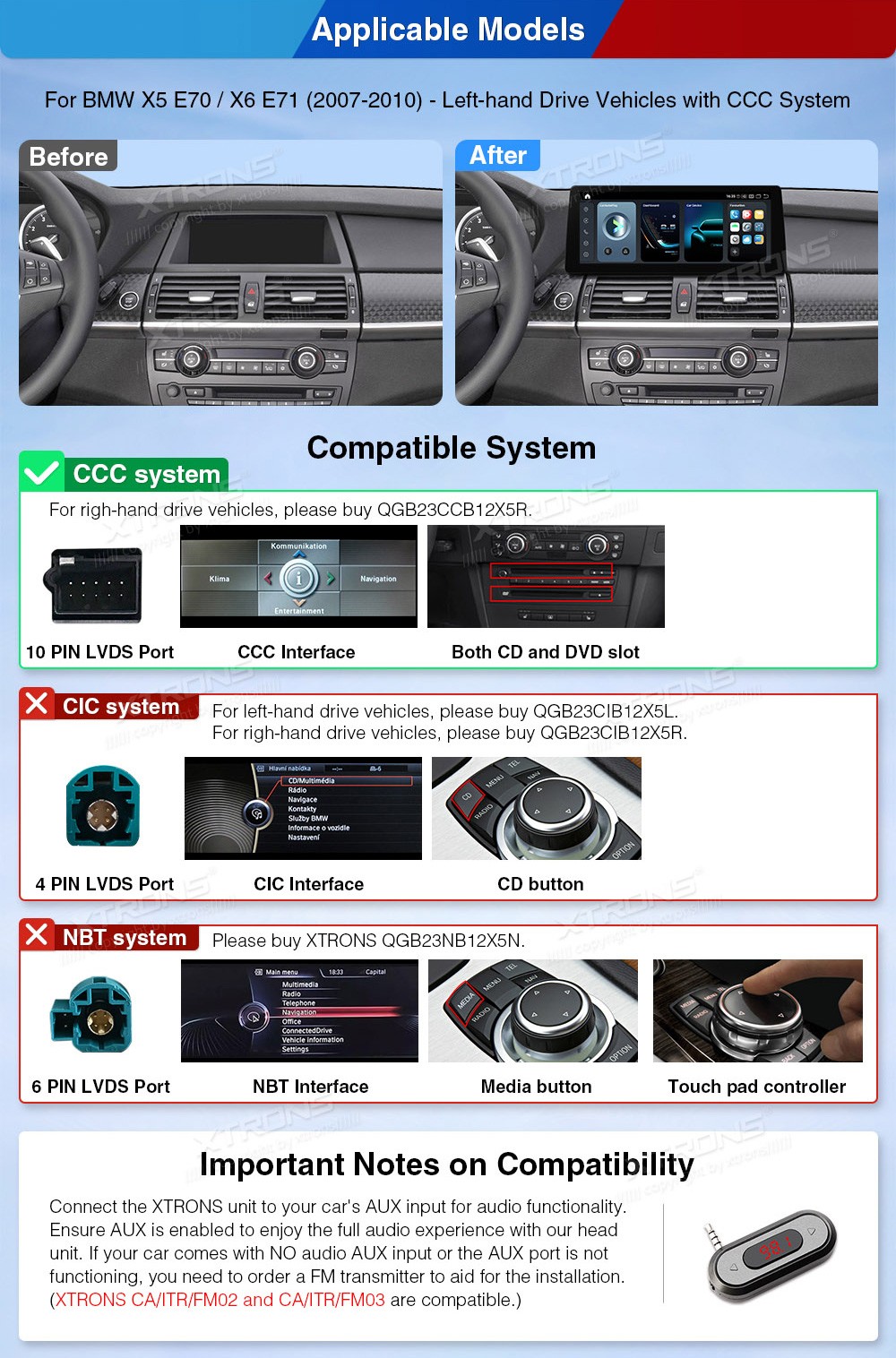 XTRONS QGB24CCB12X5L 12.3" BMW X5 E70, X6 E71 CCC Multimeedia Android 14.0 Octa-Core 4G BMW X5 E70 (2007-2010)BMW X6 E71 (2007-2010)(Sobib, kui sõidukil on CCC süsteem.)Tarkvara: Android 14.012.3" 2400*900px, 60Hz, IPS G+G HD puuteekraanProtsessor Octa-Core Qualcomm Kryo 256 2.4GHz 64bit, 6nmMuutmäl ...Lisaseadmed