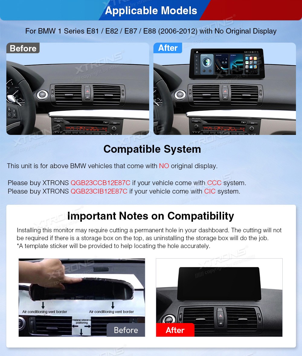 XTRONS QGB24UMB12E87L 12.3" BMW 1 Seeria E81, E82, E87, E88 Multimeedia Android 14.0 Octa-Core 4G BMW 1 Seeria E81, E82, E87, E88 (2006-2012) (Kui autol puudub originaalne ekraan.)Tarkvara: Android 14.012.3" 2400*900px, 60Hz, IPS G+G HD puuteekraanProtsessor Octa-Core Qualcomm Kryo 2 ...Lisaseadmed