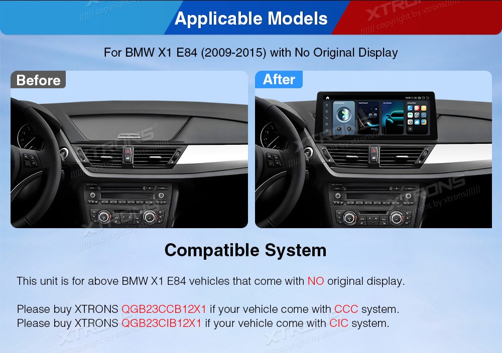 XTRONS QGB24UMB12X1 12.3" BMW X1 E84 Multimeedia Android 14.0 Octa-Core 4G BMW X1 E84 (2009-2015) (Kui autol puudub originaalne ekraan.)Tarkvara: Android 14.012.3" 2400*900px, 60Hz, IPS G+G HD puuteekraanProtsessor Octa-Core Qualcomm Kryo 256 2.4GHz 64bit, 6nmMuutmälu LPDDR4 8GB, UFS2.2 128GB ...Lisaseadmed