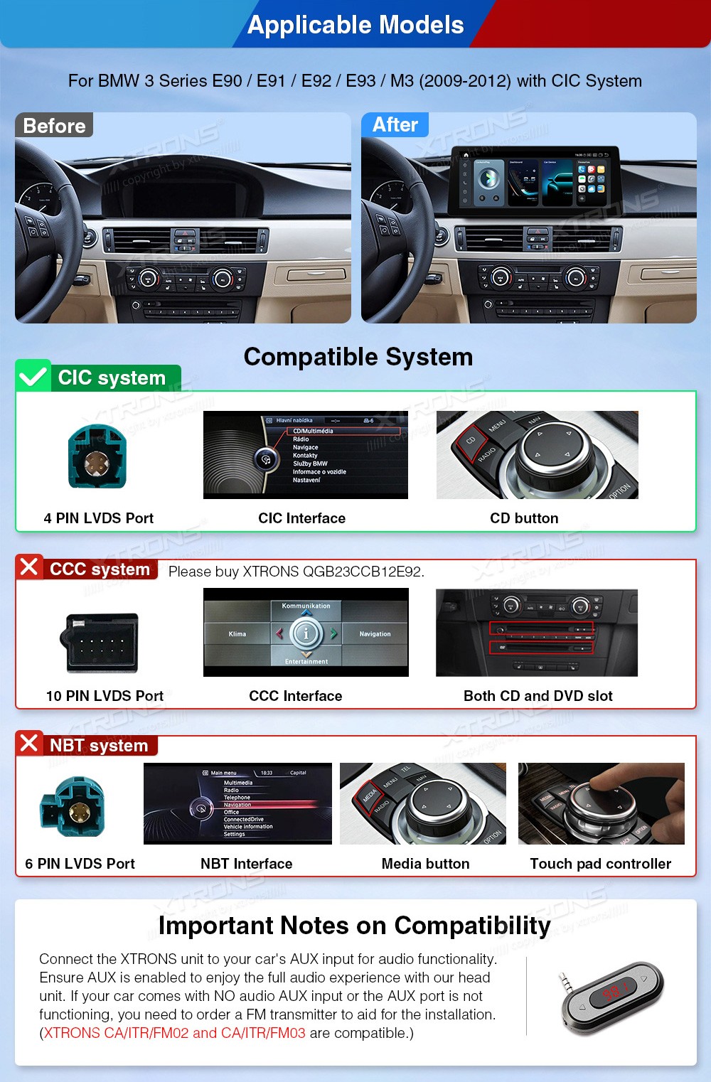 XTRONS QGB24CIB12E92 12.3" BMW 3 Seeria E90, E91, E92, E93, M3 CIC Multimeedia Android 14.0 Octa-Core 4G BMW 3 Seeria E90, E91, E92, E93, M3 (2009-2012) (Sobib, kui sõidukil on CIC süsteem.)Tarkvara: Android 14.012.3" 2400*900px, 60Hz, IPS G+G HD puuteekraanProtsessor Octa-Core Qualcomm Kryo 25 ...Lisaseadmed