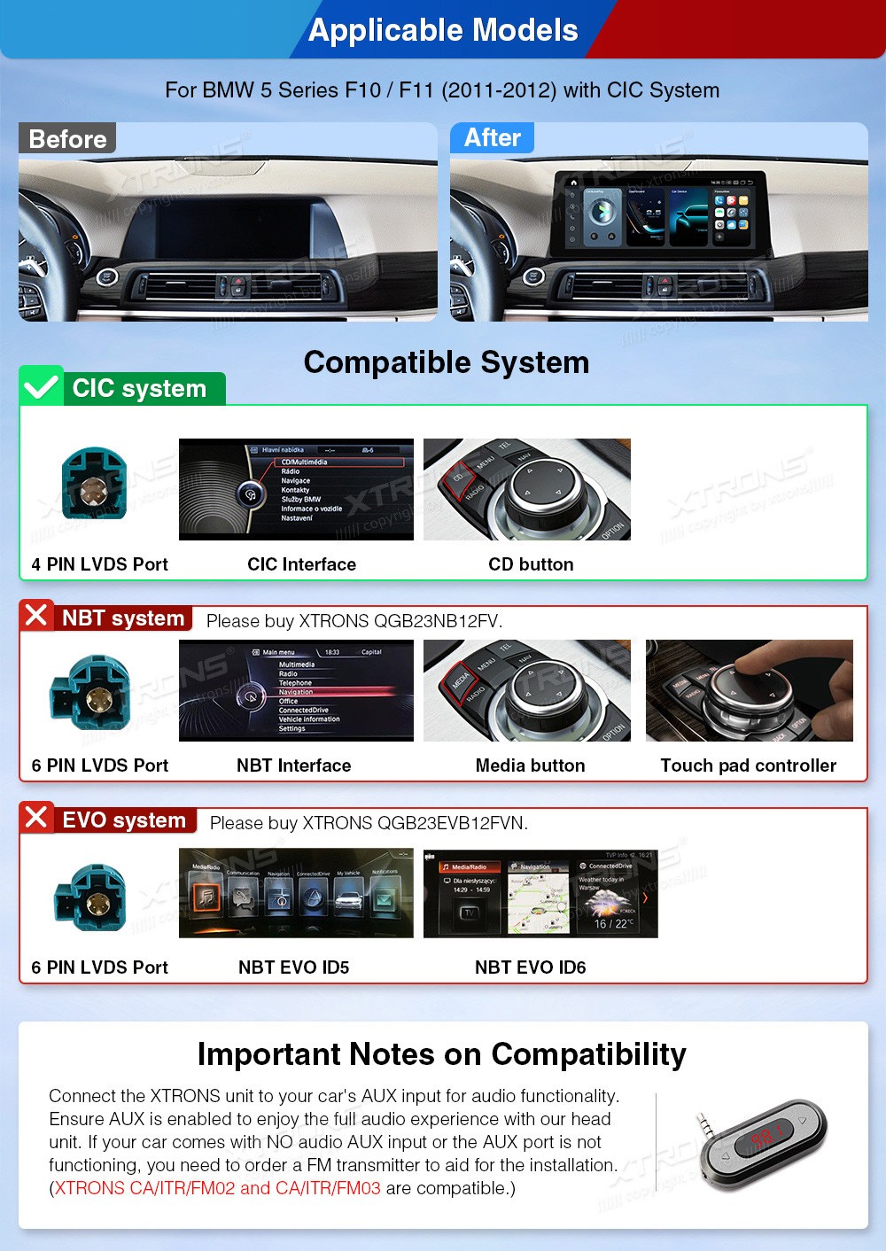 XTRONS QGB24CIB12FV 12.3" BMW 5 Seeria F10, F11 CIC Multimeedia Android 14.0 Octa-Core 4G BMW 5 Seeria F10 / F11 (2011-2012) (Sobib, kui sõidukil on CIC süsteem.)Tarkvara: Android 14.012.3" 2400*900px, 60Hz, IPS G+G HD puuteekraanProtsessor Octa-Core Qualcomm Kryo 256 2.4GHz 64bit, 6nmMuut ...Lisaseadmed