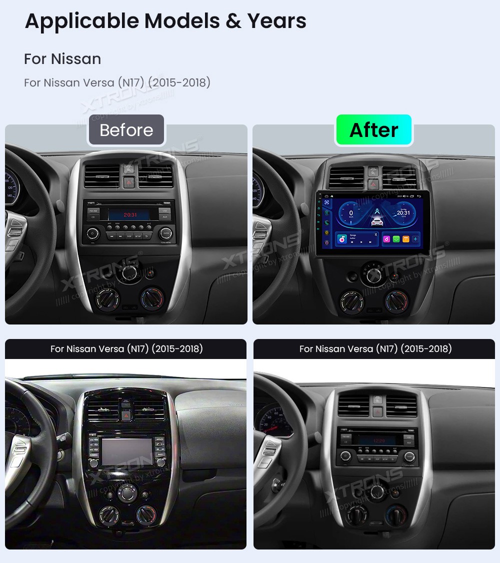 XTRONS IDP10VSN 10.1" Nissan Versa (N17) Multimeedia Android Octa-Core 4G Nissan Versa (N17) 2015-2018Tarkvara: Android10.1" HD puuteekraan 1280*720px, G+G IPSProtsessor 8xCortex-A55 Octa-Core 64bitMuutmälu DDR4 4GB, 64GB sisemäluGPS NavigatsioonCAR AutoPlay (Bluetooth ja USB) AndroidAuto (Blue ...Lisaseadmed