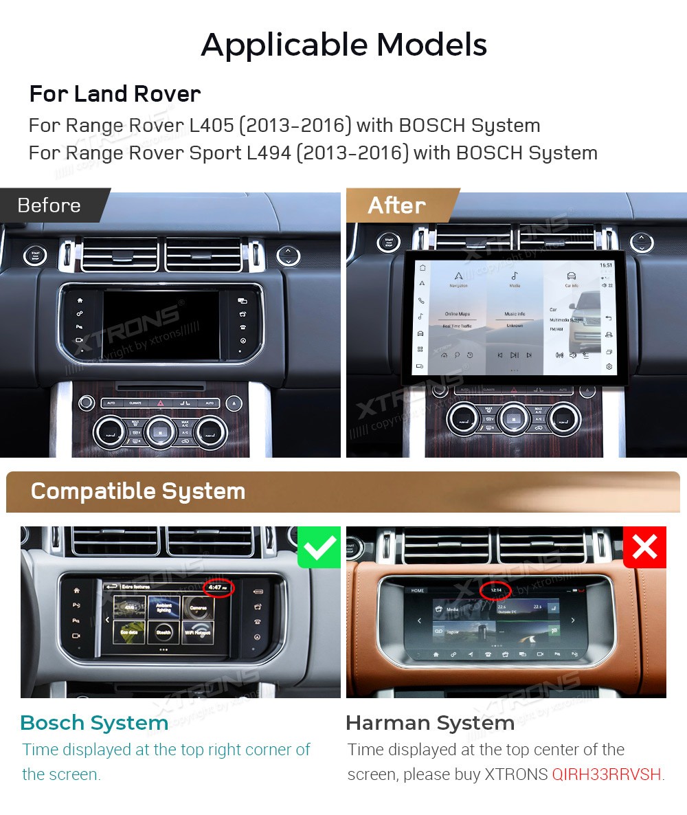 XTRONS QIRH33RRVSB 13.3" Range Rover L405/L494 Multimeedia Android Octa-Core 4G Range Rover L405 / Sport L494 (2013-2016) with BOSCH SystemTarkvara: Android 1413.3" HD puuteekraan 1920*1080px, IPS HD G+G QLEDProtsessor Qualcomm Octa-Core 4xA73+4xA53 64bit 2.8GHzMuutmälu LPDDR4 8GB, UFS2.2 ...Lisaseadmed
