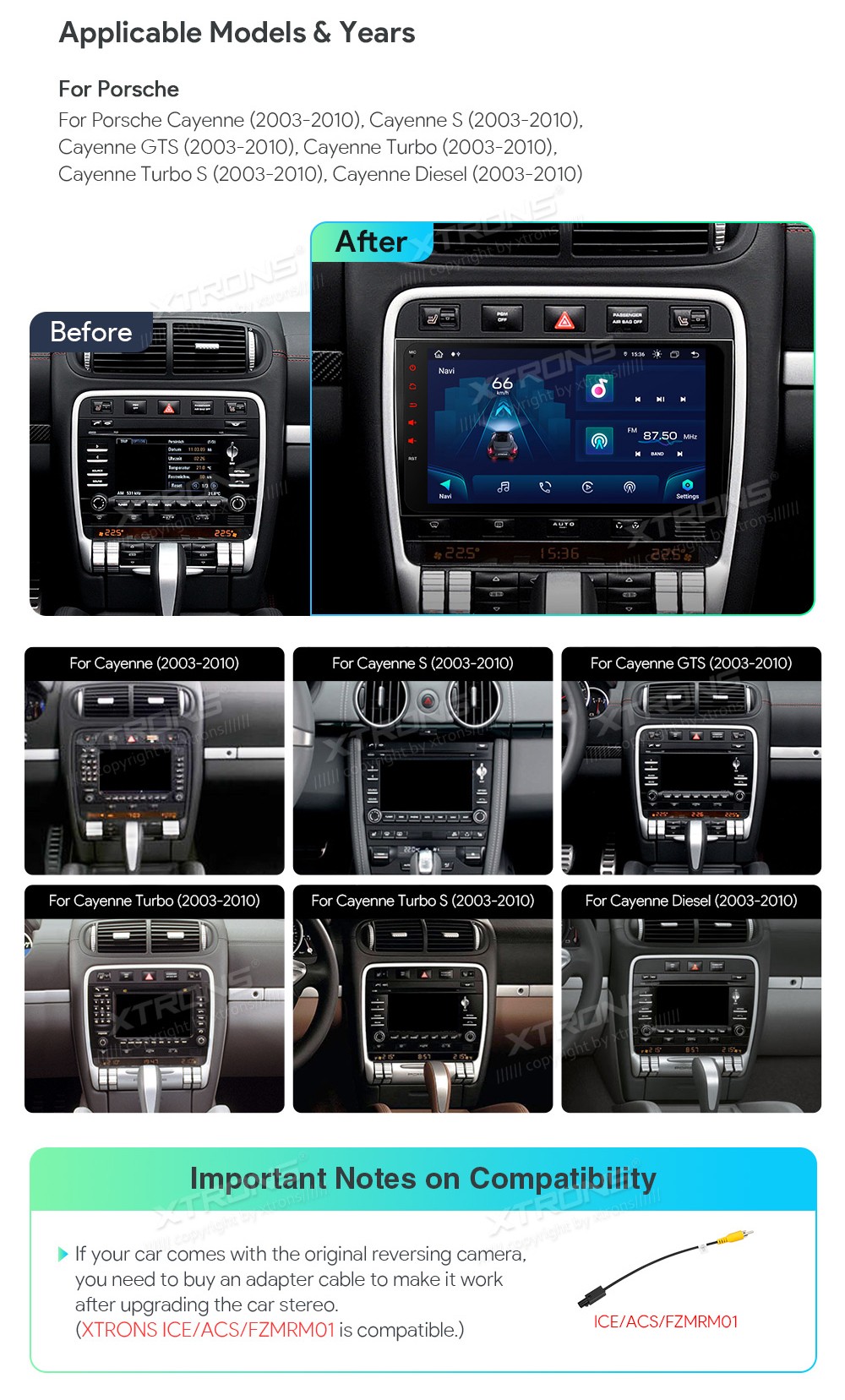 XTRONS IAH94CYPL 9.0" Porsche Cayenne Multimeedia Android 14.0 Octa-Core Porsche Cayenne (2003-2010) / Cayenne S (2003-2010) / Cayenne GTS (2003-2010) / Cayenne Turbo (2003-2010) / Cayenne Turbo S (2003-2010) / Cayenne Diesel (2003-2010)Tarkvara: Android 14.09.0" HD puuteekraan 1280*720px, IPSPr ...Lisaseadmed