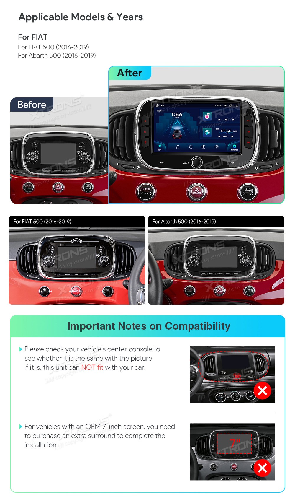 XTRONS IAH74500FL 7.0" Fiat 500, Abarth 500 Multimeedia Android 14.0 Octa-Core 4G Fiat 500 / Abarth 500 (2016-2019)Tarkvara: Android 14.07.0" HD puuteekraan 1024*600px, IPSProtsessor MediaTek Cortex A75*2+Cortex A55*6 Octa-Core 32/64bitMuutmälu 4GB DDR4, 128GB SSD sisemäluGPS NavigatsioonCAR AutoPla ...