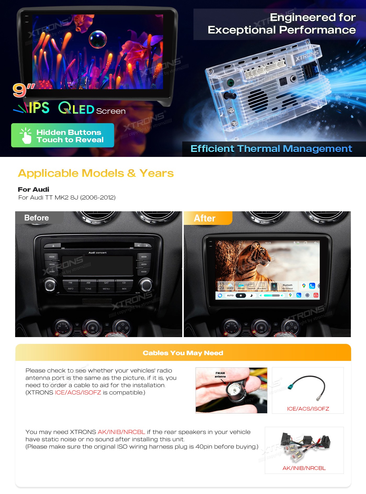 XTRONS IMHP94TTA 9.0" AUDI TT Multimeedia Android 14.0 Octa Core 4G Audi TT MK2 8J (2006-2012)9-tolline UNISOC 7865 8+128GB kahe Bluetooth QLED ekraaniga globaalne 4G AKM DSP Android autostereo navigatsioonisüsteem Audi TT MK2 8J (2006-2012) jaoksErifunktsioonid*Beast Chip, tunne vahet koh ...Lisaseadmed