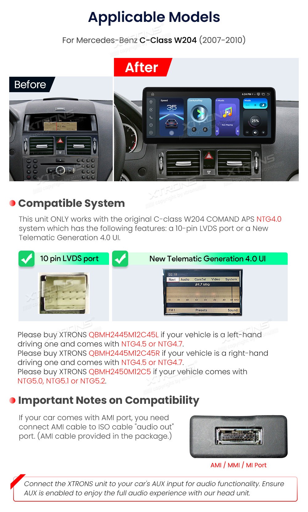 XTRONS QBMH2440M12C40 12.3" Mercedes-Benz C-Class W204 Multimeedia Android 14.0 Octa-Core Mercedes-Benz C-Class W204 (2007-2010) NTG 4.012,3-tolline Snapdragon 662 kaheksatuumaline protsessor, 8+128 GB peegeldus- ja pimestamisvastane 2K ekraan, Androidiga autostereo ja multimeediapleier Me ...Lisaseadmed