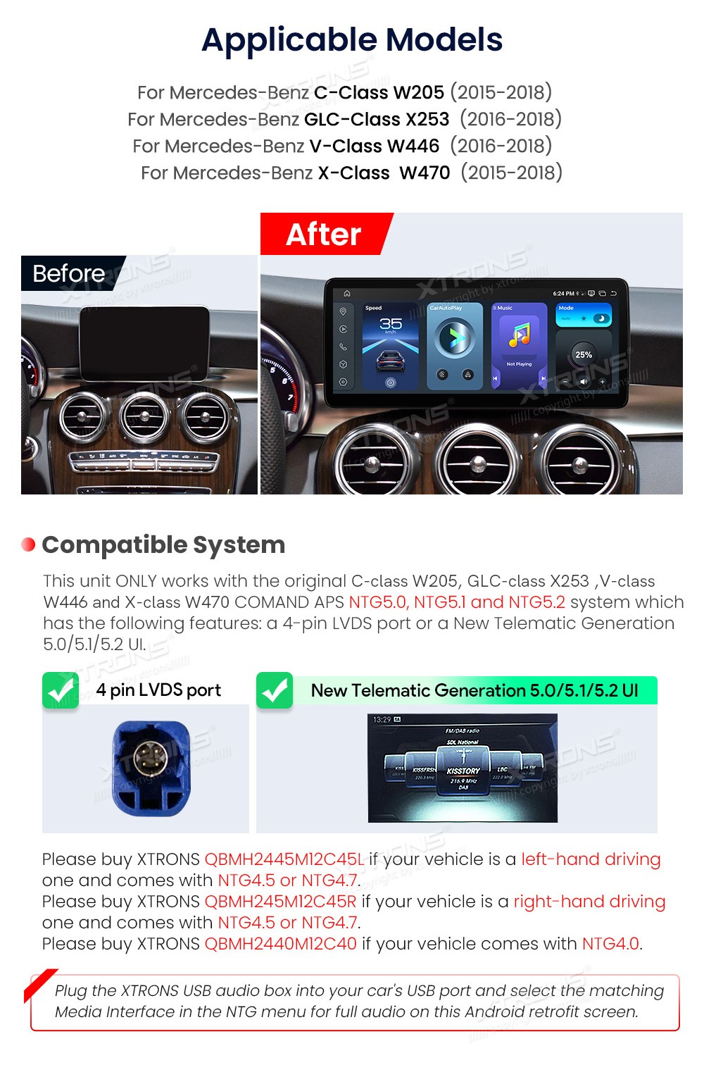 XTRONS QBMH2450M12C5 12.3" Mercedes-Benz W205, W446, W470, X253 Multimeedia Android 14.0 Octa-Core Mercedes-BenzC-Class W205 (2015-2018) NTG 5.0, NTG 5.1, NTG 5.2GLC-Class X253 (2016-2018) NTG 5.0, NTG 5.1, NTG 5.2 V-Class W446 (2016-2018) NTG 5.0, NTG 5.1, NTG 5.2X-Class W470(2015-2018) N ...Lisaseadmed