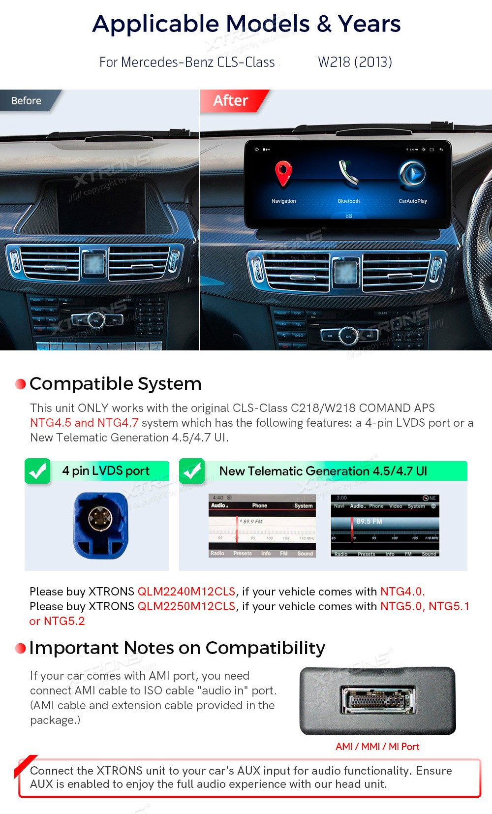 XTRONS QBMH2445M12CLS 12.3" Mercedes-Benz CLS-Class W218 Multimeedia Android 14.0 Octa-Core Mercedes-Benz CLS-Class, W218 (2013) Sedan NTG 4.5, NTG 4.712,3-tolline peegeldus- ja pimestamisvastane 2K ekraan Snapdragon 662 kaheksatuumaline protsessor, 8+128GB mäluga Android-autostereo, multimeediaplei ...Lisaseadmed