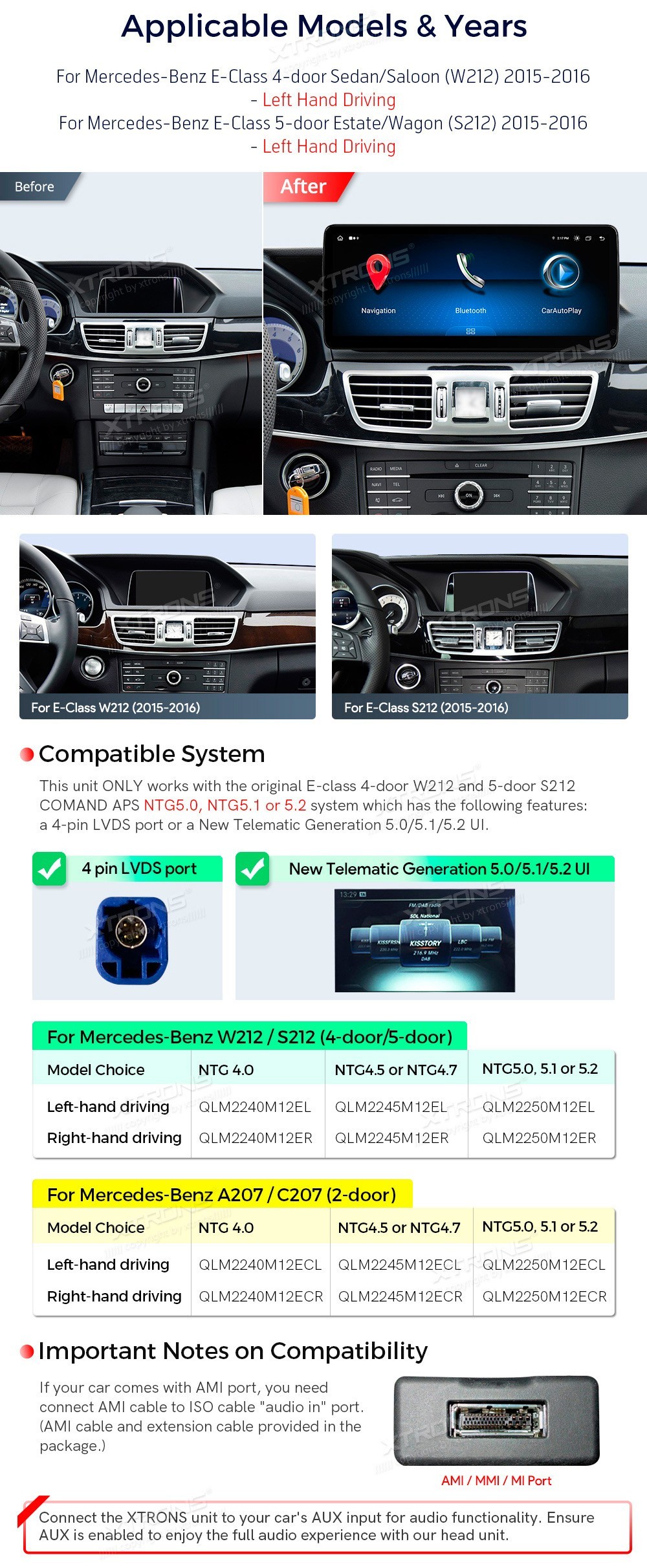 XTRONS QBMH2450M12EL 12.3" Mercedes-Benz E-Class W212, S212 Multimeedia Android 14.0 Octa-Core Mercedes-BenzE-Class 4-door Sedan/Saloon (W212) (2015-2016) NTG 5.0, NTG 5.1, NTG 5.2E-Class 5-door Estate/Wagon (S212) (2015-2016) NTG 5.0, NTG 5.1, NTG 5.212,3-tolline Snapdragon 662 kaheksatuu ...Lisaseadmed