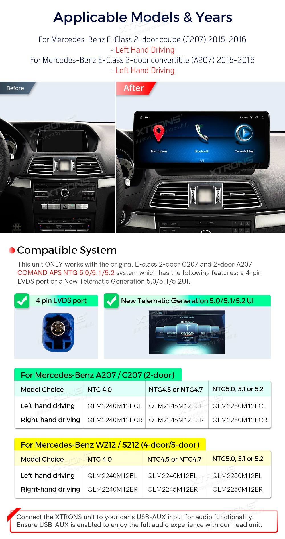 XTRONS QBMH2450M12ECL 12.3" Mercedes-Benz E-Class C207, A207 Multimeedia Android 14.0 Octa-Core Mercedes-BenzE-Class 2-door Coupe (C207) (2015-2016) NTG 5.0, NTG 5.1, NTG 5.2E-Class 2-door convertible (A207) (2015-2016) NTG 5.0, NTG 5.1, NTG 5.212,3-tolline Snapdragon 662 kaheksatuumaline ...Lisaseadmed