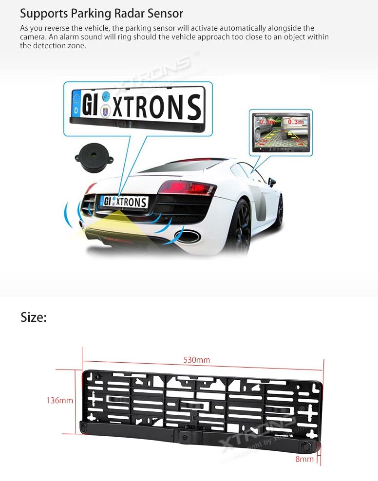 Tagurduskaamera numbri alusega Xtrons CAM720 + 2 parkimisanduridSensor: Värviline CMOS sensor PC3089Minimaalne valgus: ...Saadaval olevate toodete tarneaeg on 2-4 tööpäeva pärast kliendi tellimuse tasumist (raha laekumist Akustika.EE OÜ pangakontole). Kui tellitud kaup pole pärast tellimuse esitamist saadaval või on ette näha viivitust tarneajas, võtame Teiega ühe tööpäeva jooksul ühendust.